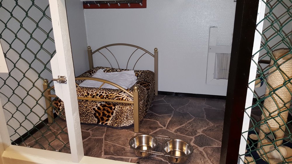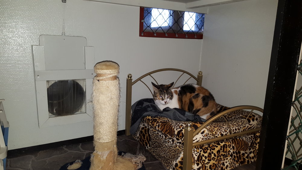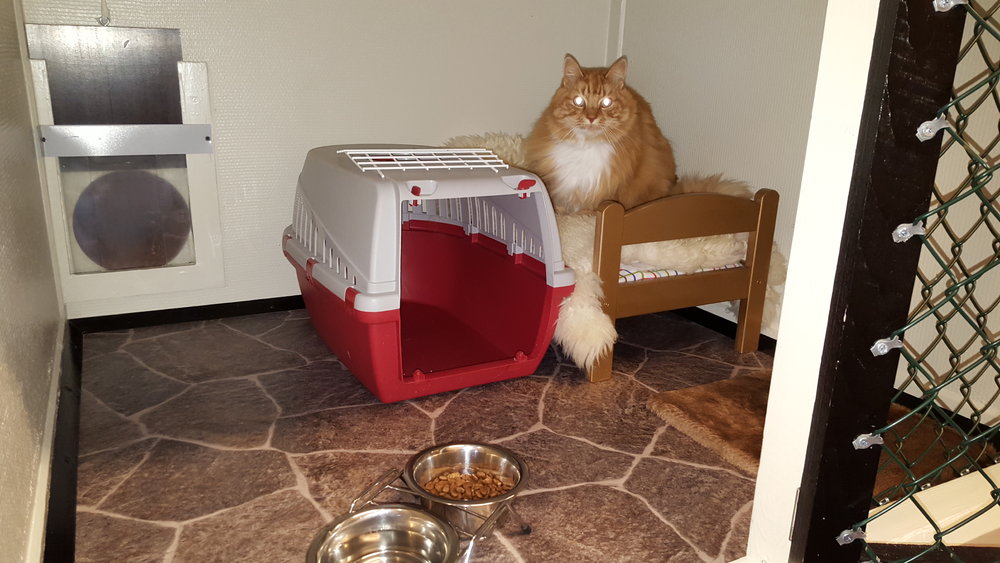 Hos Randaberg Dyrepensjonat har hver katt sin egen innegarde med flotte møbler og pene fasiliteter. Her kan kattene slappe av i fredelige omgivelser.