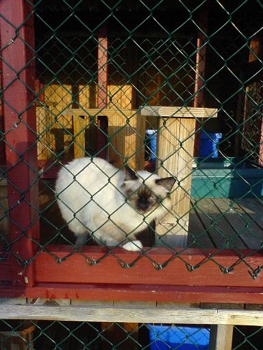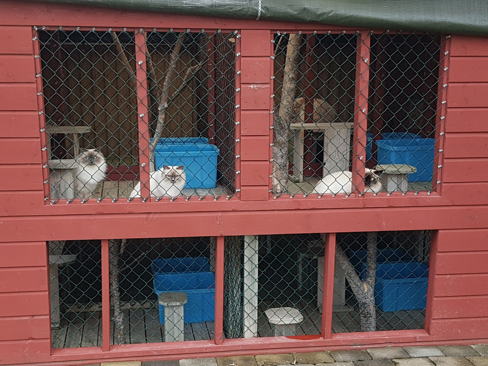 Alle kattene har tilgang til sin egen private utegarde, med gulv laget av terrassebord og masse frisk luft. Her kan de nyte hverandres selskap eller slappe av i solen.