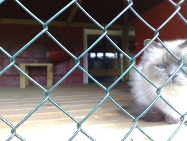 Utearealene består av gulv laget av terassebord med tak over, med netting rundt. Det er eget hus til kattedoen og det er sand av ypperste klasse oppi. Det er netting mellom hver av utegarene slik at ingen katter har fysisk kontakt med andre katter. Kattetoalettet står ute i eget hus tilknyttet den enkelte katt sitt uteareal.